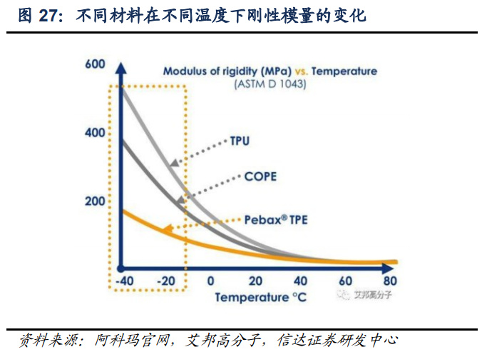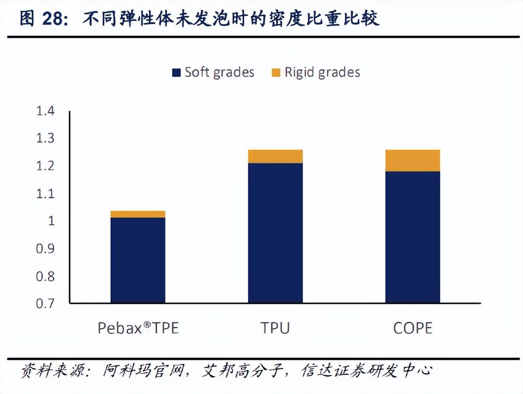 2019 年李宁采用 PEBAX 材料即尼龙弹性体为中底材料,通过超临界发泡成型工艺,生成 回弹性更好、更轻便的发泡材料,即“李宁䨻”。经过长期研发,李宁研究团队成功将超临 界流体 PEBAX 珠粒发泡材料密度控制在 0.11-0.14g/cm3 区间内,类比广泛使用的 TPU 发 泡中底材料(0.24-0.26/cm3 密度区间),鞋底重量降低 50%,能量反馈达 80%以上,尽可 能降低跑跳运动中能量损失,同时具有出众的低温抗冲击性能,以及优异的抗老化和抗日 光暴晒能力。