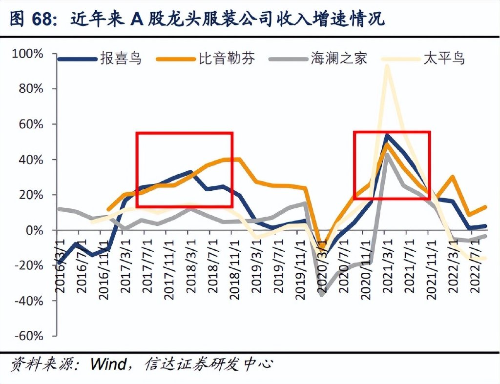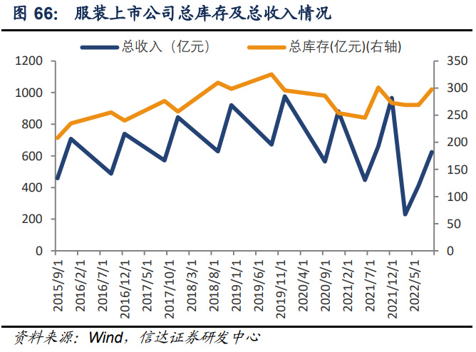 回顾本轮周期:2020 年下半年-2021 年上半年由于经济增速回升、疫情后消费需求反弹、 冷冬等因素推动,行业需求景气度回升,品牌商补库存,业绩增速、股价逐步提升。2021 下半年至今服装下游消费景气度下行,新冠疫情反复,服装品牌进入去库存阶段,收入、 业绩增速持续下降,股价同样出现调整。2022H1 新冠疫情扩散后多地出现静默、停产, 居民收入增长受到影响,消费预期边际下降,整体服装消费成长压力较大,品牌备货相对 较多,售罄率较低,导致存货积压。2022 年 7-8 月疫情影响好转,消费数据增长改善,9- 11 月疫情反复、防控压力有所提升,下游需求承压,多数服装公司终端销售影响较大,整 体消费较为疲软,品牌下调预期,备货相对谨慎,预计库存积压较少。