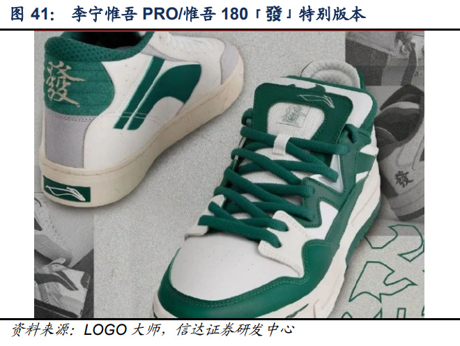 中国李宁以接近设计师品牌的运作模式,重视原创设计理念,将李宁的运动基因与中国文 化和潮流元素进行融合,18 年凭借“番茄炒蛋色”的独特设计,打破国内运动服饰的刻板 印象,使李宁成为新国潮的象征。21 年中国李宁秋冬系列以“Remake”设计理念传递轻 松自然而随性的态度,在“悟创吾意”的核心概念下,传递“无创造无意义,破旧立新” 的设计主张,“惟吾禅”和悟道 2ACE 还原千禧年复古滑板鞋的宽厚和富有防护感的鞋面视 觉,受到广泛关注。2022 年新年推出的李宁惟吾 PRO/惟吾 180「發」特别版本融入国粹 麻将元素,并以“發”字为创意理念设计,将传统工艺与美好寓意巧妙结合,彰显设计师 对于中国文化的演绎。