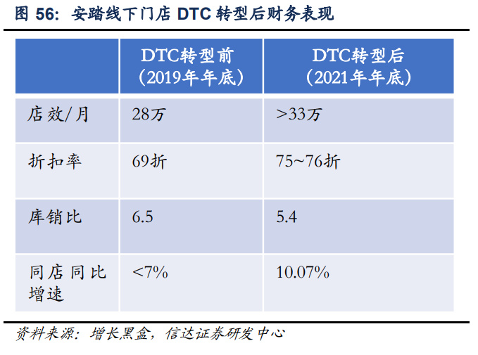 1)DTC渠道,直营适应行业需求,快速掌握终端变化。2020年安踏品牌开始推进DTC转 型,在线下进行渠道结构升级,淘汰尾部的低效门店、改造和扩张头部的门店、标准化腰 部门店,并不断优化商品、渠道规划,根据各地消费习惯实现差异化产品陈列和销售。在 线上公司注重标准化直营,2016 年后逐步收回经销商、代运营商线上门店,限制经销商开 店数量,重点推广线上自营旗舰店,并积极拓展抖音直播渠道,形成多元化线上渠道结构。 DTC 转型后安踏品牌线下门店店效、折扣率、库销比等财务指标均有改善。