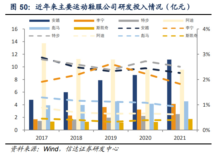 上文我们分析产品端优质国货品牌的变化,从消费者角度看到优秀产品升级。而产品变化 的背后是公司商业模式、运营投入以及管理层变化,公司积极求变打造差异化竞争优势, 在研发投入、人才选拔、商业模式运营等方面不断优化升级,从而确保产品竞争优势。 研发投入方面,本土头部运动品牌不断强化研发投入,缩短与国际一线品牌差距,研发支 出持续增长。例如近年来安踏研发支出持续提升,2021 年研发支出为 11.16 亿元,收入占 比为 2.26%。而阿迪达斯、彪马、斯凯奇等公司 2021 财年研发费用约为 1.3 亿欧元、0.62 亿欧元、0.25 亿美元,占收入比重的 0.61%、0.91%、0.39%。安踏经过多年积累、研发 投入高于多数国际品牌,为产品端科技属性提供支持。公司计划未来五年投入超 40 亿元研 发费用,整合全球研发实力,提升高阶商品占比。