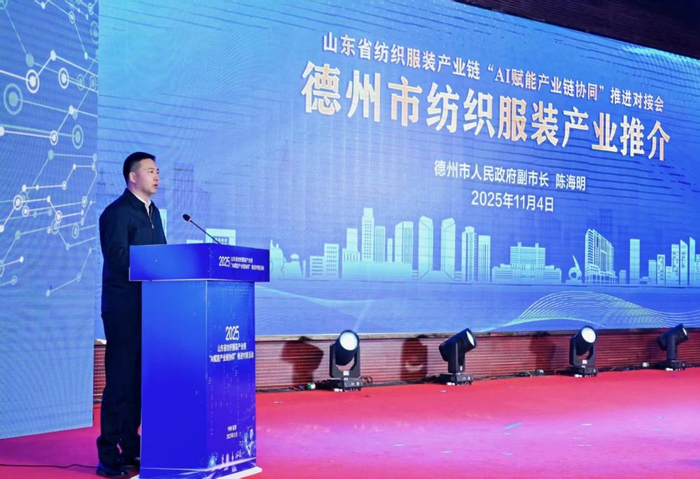 德州市副市长、市轻工纺织产业链链长陈海明在推介德州市纺织服装产业时表示,德州近年借先进制造业强市、数字强市战略,推动纺织产业研发创新与设备更新,今年1-8月规上企业销售收入132亿元,纱线产能600万吨(占全省1%),是全国最大差别化纺线生产基地,拥有多项产业荣誉,形成全产业链。德州通过三举措推动产业发展:一是技改赋能,近三年实施36个技改项目,关键设备更新率超70%,夏津县等获多项数字化荣誉,华源生态改造后生产效率提升三成;二是科技创新,深化校企合作,制定12项标准,培育隐形冠军企业;三是开放合作,举办峰会、组团出海,今年前3季度纺织服装出口47.3亿元,同比增46.1%。“十五五”期间,德州将以产业集聚为导向,打造两大核心产业集群,加大科技投入,优化产业生态,期待与企业家深化合作,推动产业高质量发展。