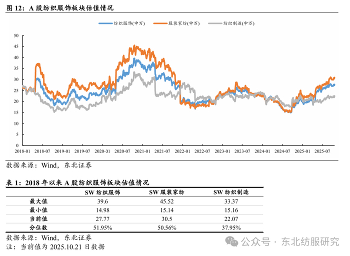 从估值角度看,纺织服饰板块估值修复,向上仍有空间。截至2025年10月21日,纺织服饰板块估值为28倍,处于2018年以来50%分位左右水平。其中服装家纺板块估值修复至31倍,同样达到2018年以来50%分位水平;纺织制造板块受美国关税影响,目前估值22倍,仍处于2018年以来40%分位以下水平,向上仍有空间。