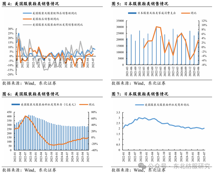 2025年1—7月,美国服装及服装配饰店销售额/服装批发商销售额分别同比增长4.3%/5.4%。日本2025年1—6月份家庭服装鞋类平均消费支出同比增长0.3%,基本延续2024年的稳健增长态势;库存层面,截至2025年7月,美国服装及服装面料批发商库存相比2022年的高点下降30%以上,同比下降1%。2025年库销比始终维持在2左右健康水平。