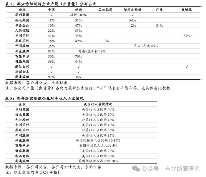 我们对于纺织制造企业产能布局及美国收入占比进行梳理: