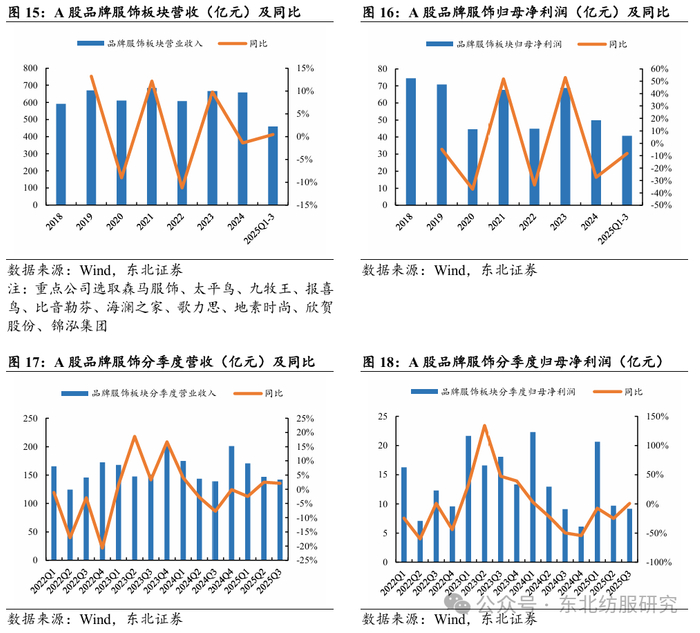 品牌服饰营收端趋稳,利润端仍待弹性释放。2025Q1-3,A股品牌服饰重点公司营业收入同比基本持平为459.2亿元。分季度来看,Q1营收同降2.5%,Q2以来在低基数加持下,终端温和修复,Q2/Q3营收分别同比增长2.5%/2.1%。