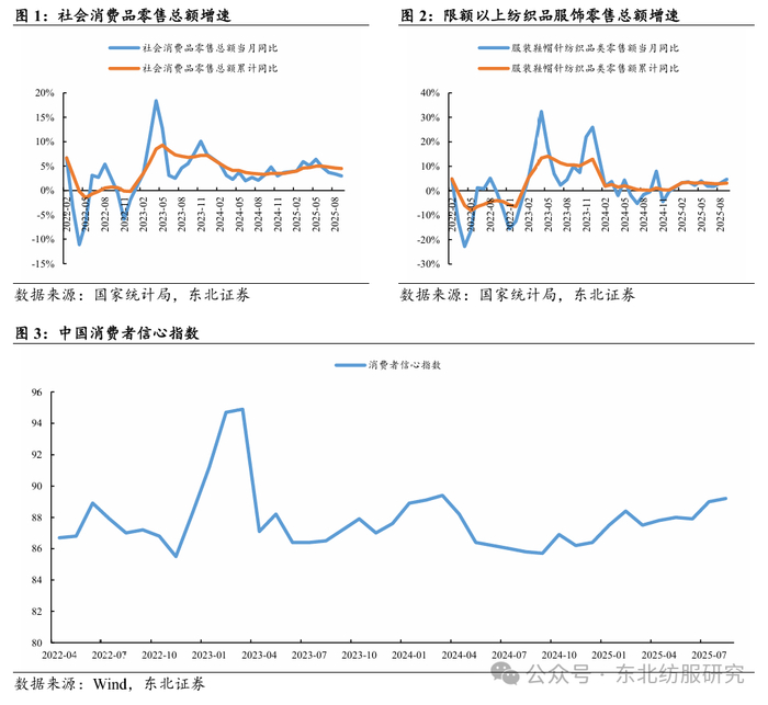 2025年国内服装行业零售温和修复。2025年1—9月我国服装鞋帽针织品类零售额累计同比增长3.1%至1.1万亿元,仍弱于整体社会消费品零售表现(同增4.5%)。但随着消费者信心修复,可选品类销售持续改善。相较于2024年服装鞋帽针织品类零售额同比增长0.3%,整体消费品零售同增3.5%的差距已明显缩小。