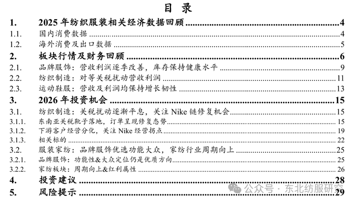 2)预计2026年服装消费仍将处于波动复苏过程,消费者信心在整体仍较为保守的情况下,功能性及大众定位的服装消费仍将优于大盘。推荐【安踏体育】及【361度】。