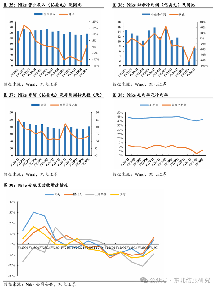 分地区来看,FY2026Q1北美地区货币中性口径营收同增4%,持续推进库存去化,库存金额同比持平,旧品占比接近正常水平;EMEA地区货币中性口径营收同增1%,Nike同批发伙伴合作态势良好,电商转型进度领先其他地区。同时库存量同比下降中单位数,库存去化领先;大中华区营收同降10%,线下门店客流下降较为严重。期末存货同降11%,但旧品占比仍处于较高水平。