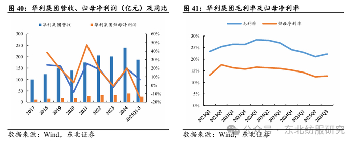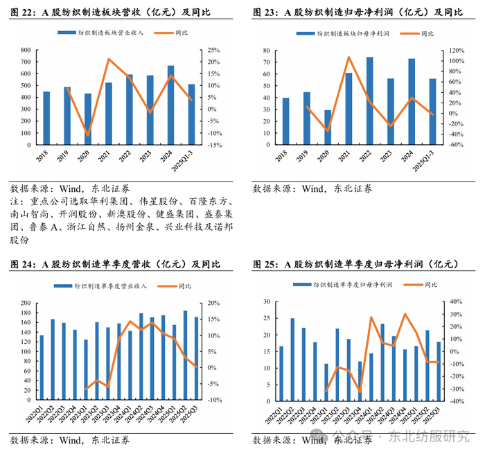 对等关税扰动,纺织制造营收增速下滑,利润承压。纺织制造板块于2021年下游品牌订单高增及海外订单转移中充分受益,而后2022—2023年海外品牌逐渐进入库存去化周期。2023Q4以来行业订单逐渐修复,2024年纺织制造板块重点公司营业收入同比增长14.1%至666.7亿元。2025Q1维持良好趋势,营收同增9%;Q2以来在美国对等关税扰动下营收增速下滑,Q2/Q3分别同比+3%/基本持平。2025Q1-3营业收入同增3.8%至510.6亿元。