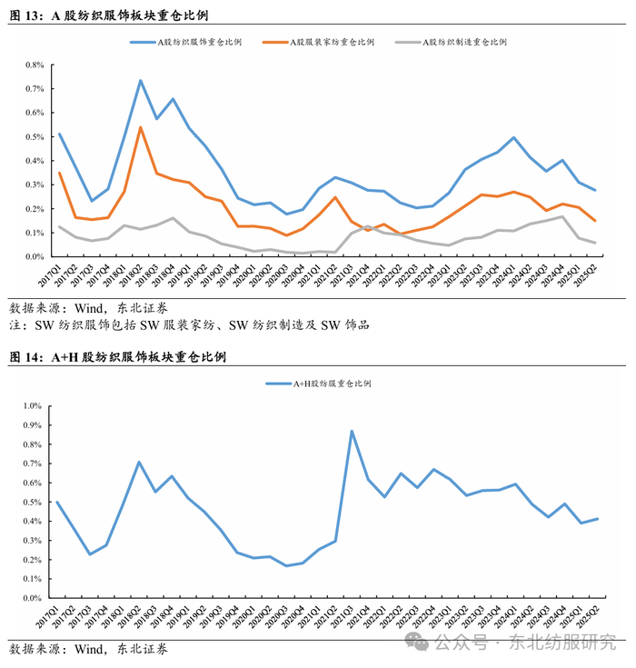 港股层面,2025年特步国际持仓增加较多,申洲国际及晶苑国际受关税影响持仓减少。A+H股整体重仓比例2025年基本稳定,2025Q2为0.41%。