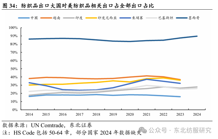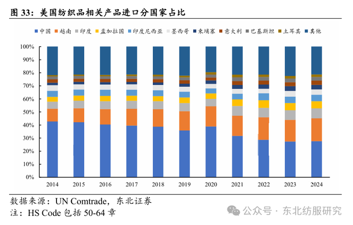 中国及东南亚贡献美国纺织品进口占比约70%。根据UN Comtrade数据,2024年美国纺织品相关产品进口中,中国/越南/印度/孟加拉国/印度尼西亚/墨西哥/柬埔寨分别占比27.6%/17.5%/7.7%/5.4%/5%/4.1%/3.5%。自2018年第一轮对中国纺织品征收关税以来,中国进口占比加速下降,但仍为第一大纺织品进口来源。期间越南等东南亚国家进口占比提升;从对美出口角度来看,2023年中国/越南/印度/印度尼西亚/柬埔寨/巴基斯坦/墨西哥对美国纺织品出口占全球出口的16%/36.8%/26.4%/36%/32.3%/25.3%/87.5%,除中国外对美出口占比均较高。