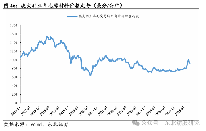 2024年以来羊毛价格长期处于低位,推动供给端削减。自2025年8月以来,冬季备货需求催化羊毛价格快速上行。截至11月6日,澳大利亚羊毛交易所东部市场综合指数924美分/公斤,同比上涨23.4%。公司Q3末库存20.6亿元,预计羊毛库存处于历史同期较高水平,有望充分受益于原材料价格上涨,增厚盈利能力。