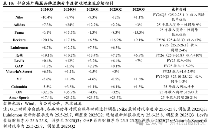 海外领先品牌经营分化。从国际服装品牌角度来说,经营状态有所分化。综合性运动品牌中,Adidas终端从快速修复转换为稳健增长,上调25全年收入增速指引至9%。Puma终端承压,预计25全年收入下降低双位数。Nike仍处于调整周期,FY26Q2增速转正;ON及Amer Sports等新兴垂类运动品牌仍维持双位数较快增速指引;休闲服装品牌中,迅销维持26财年10%收入增速的强劲指引。Levi’s及GAP等品牌收入稳健修复。