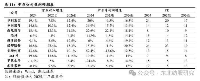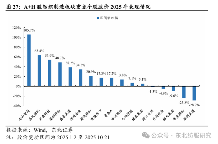 头部标的估值下行,拓展新领域公司表现领先。2025年纺织制造企业大部分股价上行,头部估值较高的华利集团、伟星股份因基数走高、盈利能力波动等因素影响而下跌较多;南山智尚、兴业科技积极拓展新兴领域应用,股价表现领先;晶苑国际新品类订单顺利放量驱动营收业绩增长,股价上涨63.4%;诺邦股份所在无纺布领域具备较高景气度,订单高增长驱动股价上涨48.7%。