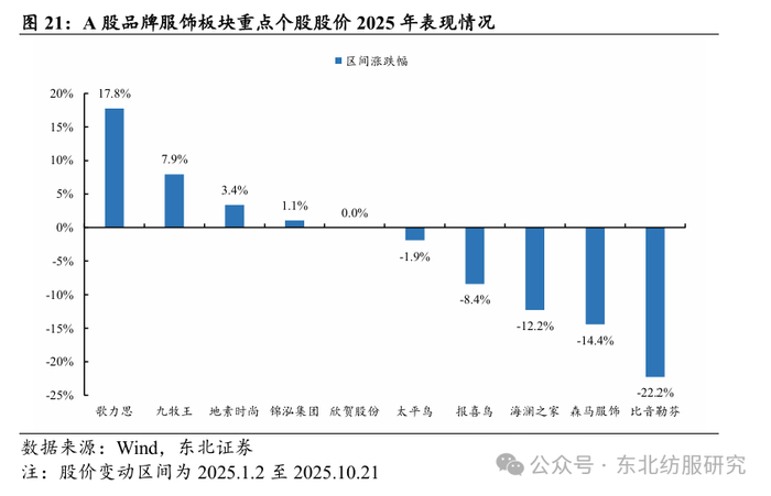 个股表现分化严重,新消费属性相对更优。2024年在消费者保守谨慎、终端表现较弱背景下,大众服饰森马服饰及海澜之家股价表现更优。2025年终端维持弱修复,大众服饰标的估值下行,海澜之家/森马服饰股价下跌12.2%/14.4%;中高端男装标的报喜鸟/比音勒芬仍有承压,股价下跌8.4%/22.2%;中高端女装标的歌力思、地素时尚及锦泓集团具备一定的新消费属性,股价上涨17.8%/3.4%/1.1%。