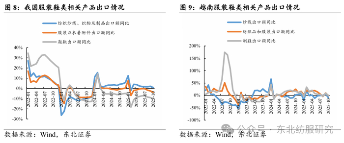 关税扰动中国及越南出口。2025年1-10月我国纺织纱线、织物及制品出口月出口额同增0.9%。下游服装、衣着附件及鞋靴出口较弱,出口额分别同比下降3.8%/10%;越南纺织品和服装/制鞋出口额分别同比增长8.4%/7.2%,整体维持较快增长。4月美国宣布对等关税后,增速有所下滑,7月初双方达成贸易协议,9月份出口额恢复增长态势。