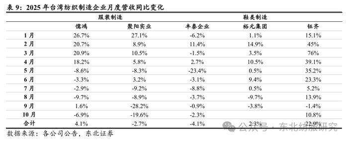 Ø 短期来看,综合上述纺织制造主要上市公司的东南亚布局以及越南、柬埔寨及印度尼西亚的对等关税确定,我们认为关税的不确定性影响已经减弱。Q2及Q3由于关税的不确定性影响客户下单节奏,存在订单延后发货影响收入确认、小规模订单增加影响制造企业生产规划及开工率导致的盈利能力下降等不利因素。从上文越南出口数据及台湾纺织制造企业月度数据来看,Q2/Q3均出现一定的增速波动,9-10月份陆续出现订单改善。