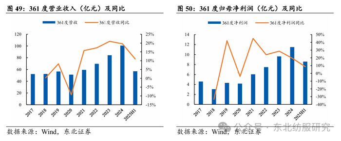 361度2025H1营收同增11%至57.1亿元,归母净利润同增8.6%至8.6亿元。2025Q3 361度成人及童装仍维持10%左右的增速,保持领先于行业的增速。