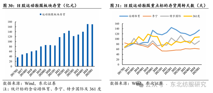 运动鞋服品牌存货仍处于健康水平。经历2023年的库存去化,2024H1各运动鞋服品牌库存均处于健康状态。2024年暖冬影响冬季服装销售,板块库存有所增加,但仍处于可控水平。截至2025H1,安踏体育/361度存货周转天数分别同比增加22/24天至135/108天,李宁及特步国际基本持平为61/92天。