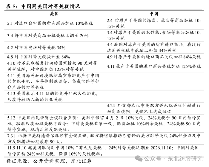 中美关系缓和,关税再度延缓。4月2日美国宣布对所有国家征收10%基础关税,同时对美国贸易逆差较大的国家征收“对等关税”,中国为34%。后续中国出台反制措施,至4月25日双方对等关税提高至125%。5月12日,中美联合发布日内瓦公告,关税情况有所缓和。7月31日再次宣布展期90天。经过10月的韩国釜山中美元首会晤,美国对中国的24%加征关税延期1年,10%“芬太尼关税”取消。中国采取相对应措施,后续实际落地情况仍存在不确定性。