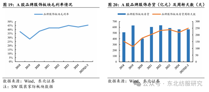 存货水平保持健康,毛利率提升。截至2025Q3,服装家纺板块存货金额同比下降11.4%至562.8亿元,存货周转天数同比下降3天至253天。存货在经历2024年的去化后保持相对健康水平。在存货保持健康的状态下,各公司折扣水平基本维持,新品出售比例提升,推动板块毛利率同比提升1.8pct至45.6%。