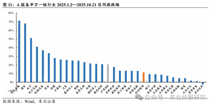 2025年以来,A股纺织服饰板块上涨11.3%,同期沪深300指数上涨20.6%,跑输9.3pct,申万一级行业排名21。其中,服装家纺细分板块上涨8.4%,纺织制造细分板块上涨8%。