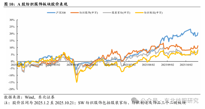 纺织服装指数震荡上行,表现弱于大盘。2025年以来,A股纺织服饰板块上涨11.3%,同期沪深300指数上涨20.6%,跑输9.3pct,申万一级行业排名21。服装家纺细分板块上涨8.4%,纺织制造细分板块上涨8%。