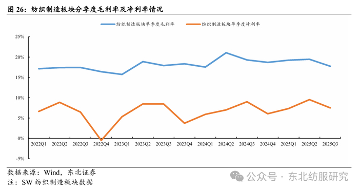 利润端,2025Q1-3纺织制造重点公司归母净利润同降2.5%至56亿元。分季度来看,Q1同增15.4%,Q2/Q3分别同降8.4%/8.5%。对等关税扰动客户下单节奏,纺织制造公司产能利用率波动影响盈利能力,Q2/Q3板块整体毛利率均同比下降1.6pct至19.5%/17.8%,Q3净利率同比下降1.5pct至7.5%。