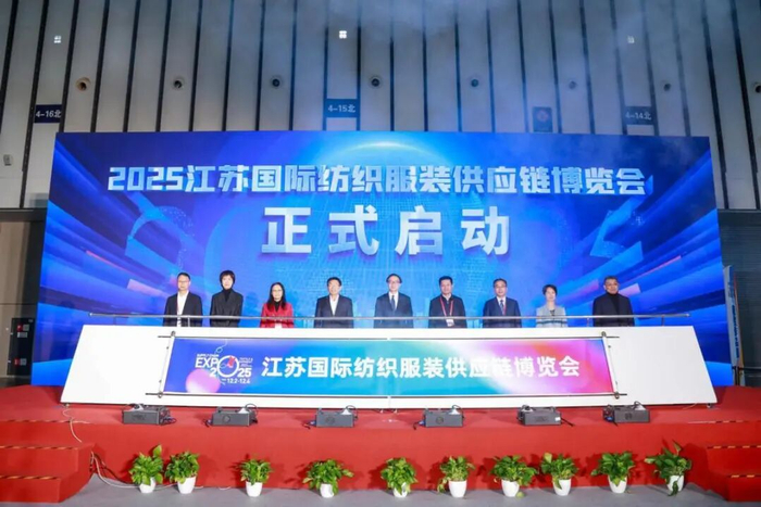 活动上,领导嘉宾们共同为“2025江苏国际纺织服装供应链博览会”启幕,各方以联盟为舟,以党建为桨,助力服装纺织产业高质量发展。