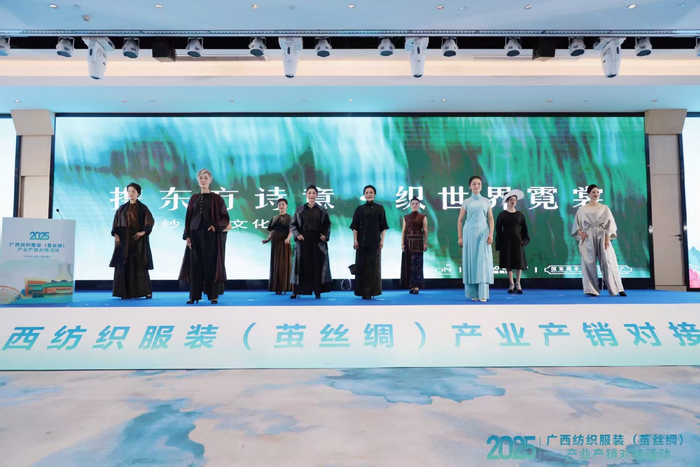 活动设置了精准务实的对接环节。区内5家重点企业与来自浙江、江苏、广东及欧洲的4家海外外企业代表,分别就市场拓展、技术合作等话题进行了交流。由广西嘉联、华虹、中健、广美制衣等企业带来的服装、壮锦与香云纱非遗服饰走秀,生动展现了“非遗+时尚”的融合创新,成为全场亮点。