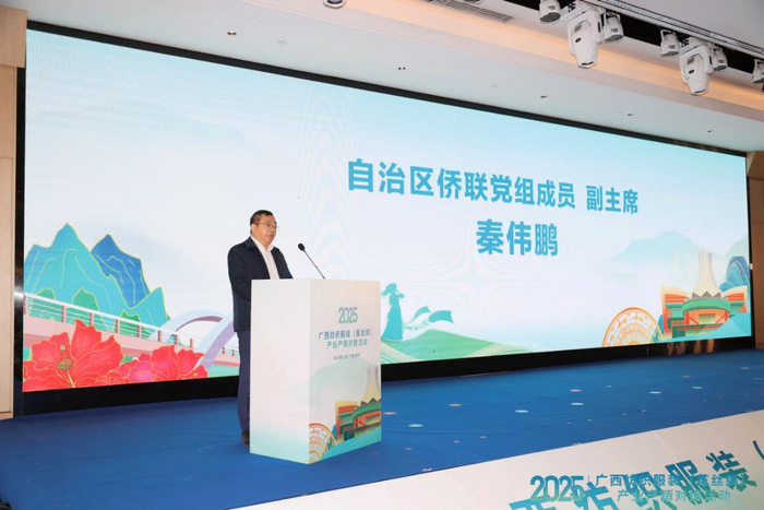 自治区归国华侨联合会党组成员、副主席秦伟鹏在发言中指出,广大侨胞是广西融入新发展格局、扩大对外开放的独特优势和重要桥梁。广西作为重要侨乡,侨商力量深厚,多家重点民营企业为侨资背景。侨联积极构建服务体系,推动“桂品出海”,助力壮锦、香云纱等丝绸精品走向世界。他期待广大侨胞担当广西纺织服装产业的“全球推广大使”,携手各方把握政策机遇,共同开拓国内外市场,让“广西制造”闪耀全球。