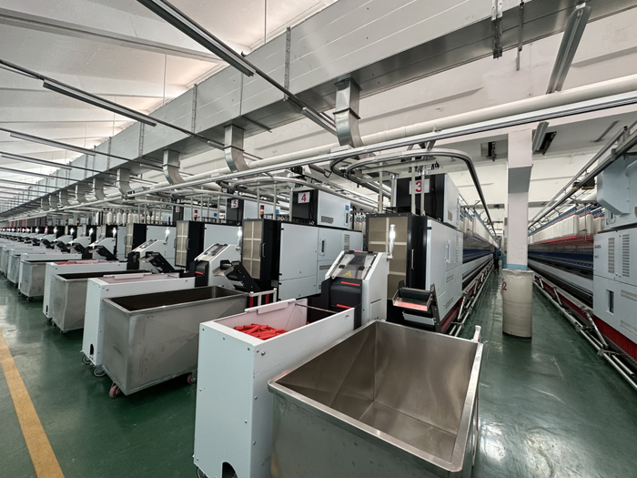 “这是公司投入5400万元从德国引进的9台A9高速高产全自动气流纺纱机。”现场工作人员告诉记者,纺纱已实现智能化生产,整个车间9条生产线每班仅需3名工人。